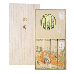 お線香の元祖「仙年香」を進物用に特別調合した「吟撰仙年香」と、希少な天然蜜蝋を配合した絵蝋燭をセットにした、ワンランク上のご進物。